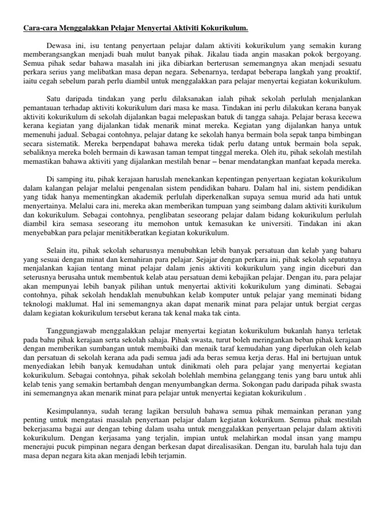 Semua pelajar digalakkan menyertai kegiatan kokurikulum . Kegiatan kokurikulum merupakan aspek penting dalam melahirkan remaja yang berguna. Kegiatan tersebut termasuklah aktiviti badan beruniform, kelab dan persatuan serta sukan dan permainan. Karangan faedah menyertai aktiviti kokurikulum pt3 spm karangan about press copyright contact us creators advertise developers terms privacy policy & sa. Kegiatan tersebut termasuklah aktiviti badan beruniform kelab dan persatuan serta sukan dan permainan.